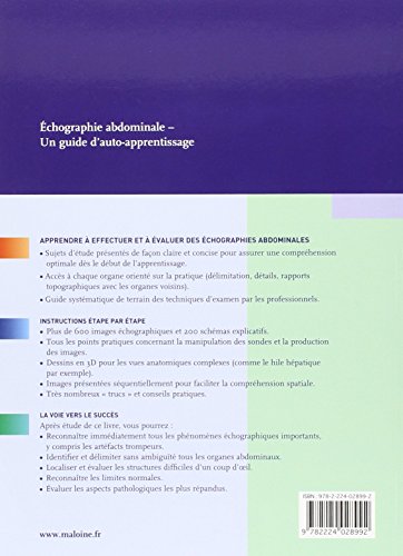 Sujets d'étude présentés de façon claire et concise pour assurer une compréhension optimale dès le début de l'apprentissage. Accès à chaque organe orienté sur la pratique (délimitation, détails, rapports topographiques avec les organes voisins). Guide systématique de terrain des techniques d'examen par les professionnels. Plus de 600 images échographiques et 200 schémas explicatifs. Tous les points pratiques concernant la manipulation des sondes et la production des images. Dessins en 3D pour les vues anatomiques complexes (comme le hile hépatique par exemple). Images présentées séquentiellement pour faciliter la compréhension spatiale. Très nombreux trucs et conseils pratiques. Après étude de ce livre, vous pourrez : Reconnaître immédiatement tous les phénomènes échographiques importants, y compris les artéfacts trompeurs. Identifier et délimiter sans ambiguïté tous les organes abdominaux. Localiser et évaluer les structures difficiles d'un coup d'œil. Reconnaître les limites normales. Évaluer les aspects pathologiques les plus répandus.Rang parmi les ventes Amazon: #327564 dans LivresPublié le: 2005-10-12Dimensions: 7.68" h x .63" l x 10.63" L, Reliure: Broché253 pagesPrésentation de l'éditeurSujets d'étude présentés de façon claire et concise pour assurer une compréhension optimale dès le début de l'apprentissage. Accès à chaque organe orienté sur la pratique (délimitation, détails, rapports topographiques avec les organes voisins). Guide systématique de terrain des techniques d'examen par les professionnels. Plus de 600 images échographiques et 200 schémas explicatifs. Tous les points pratiques concernant la manipulation des sondes et la production des images. Dessins en 3D pour les vues anatomiques complexes (comme le hile hépatique par exemple). Images présentées séquentiellement pour faciliter la compréhension spatiale. Très nombreux " trucs " et conseils pratiques. Après étude de ce livre, vous pourrez : Reconnaître immédiatement tous les phénomènes échographiques importants, y compris les artéfacts trompeurs. Identifier et délimiter sans ambiguïté tous les organes abdominaux. Localiser et évaluer les structures difficiles d'un coup d'œil. Reconnaître les limites normales. Évaluer les aspects pathologiques les plus répandus.